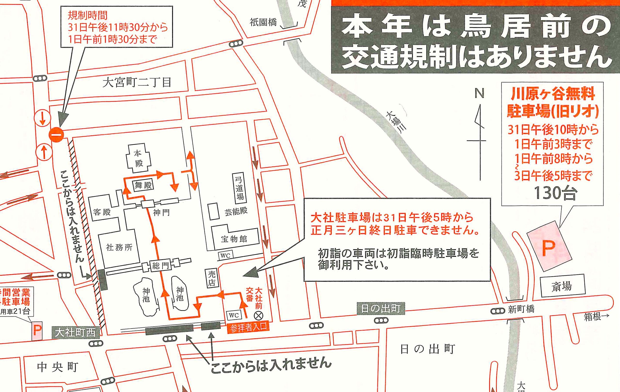 大晦日から元日にかけては、毎年、多くの方が三嶋大社へ初詣に来られます。駐車場入り口から境内にお入りください。駐車場入り口から御殿までは一方通行となります。境内では、係員のの指示に従い、決められた順路で参拝をお願い致します。