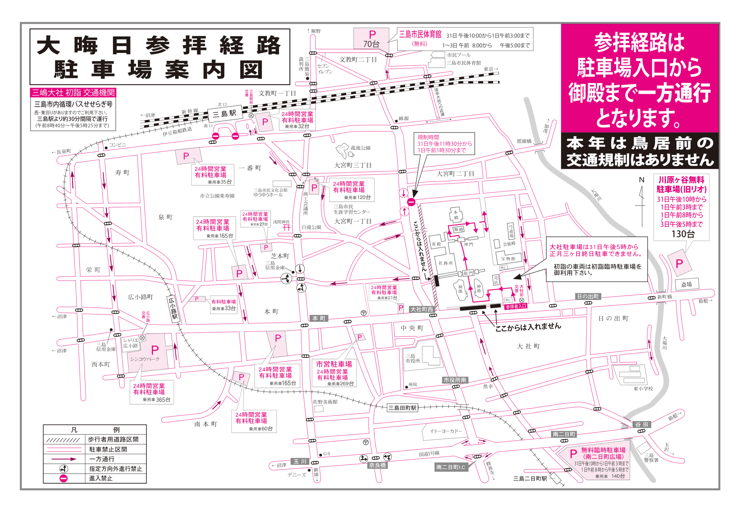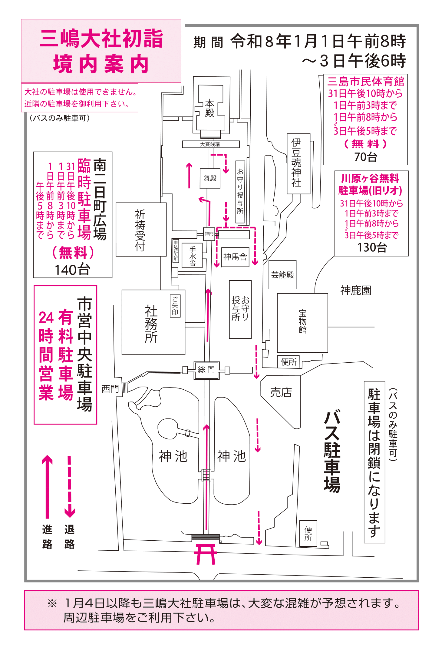 ※1月3日まで、三嶋大社の駐車場は利用できません(バスのみ駐車可)。また例年、初詣の時期、三嶋大社周辺は大変混雑しますので、公共交通のご利用をお勧めいたします。
