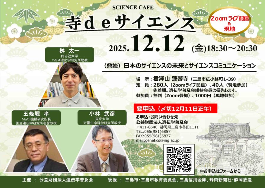 【2025年12月12日】豪華ゲスト集結!国立遺伝学研究所主催 「寺deサイエンス」開催のお知らせ
