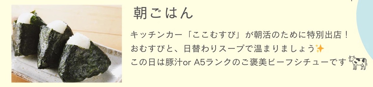 ※朝食は、アクティビティとは別途、「ここむすび」さんのキッチンカーでお買い求めください。