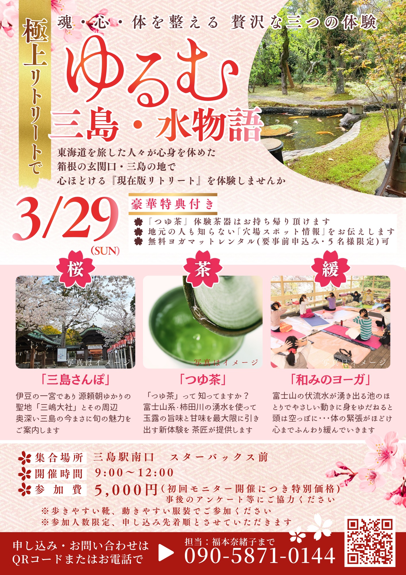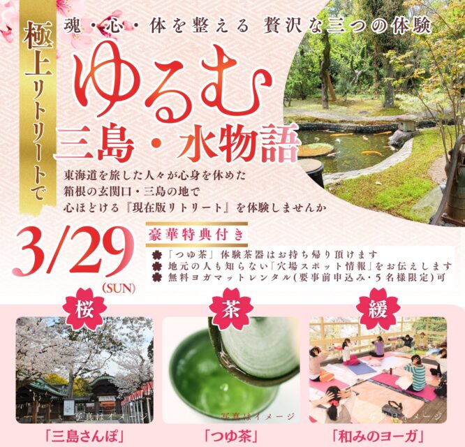 富士山の伏流水が湧き出る三島のまちを舞台に、散策・お茶体験・リラクゼーションを組み合わせたプログラムが開催されます。